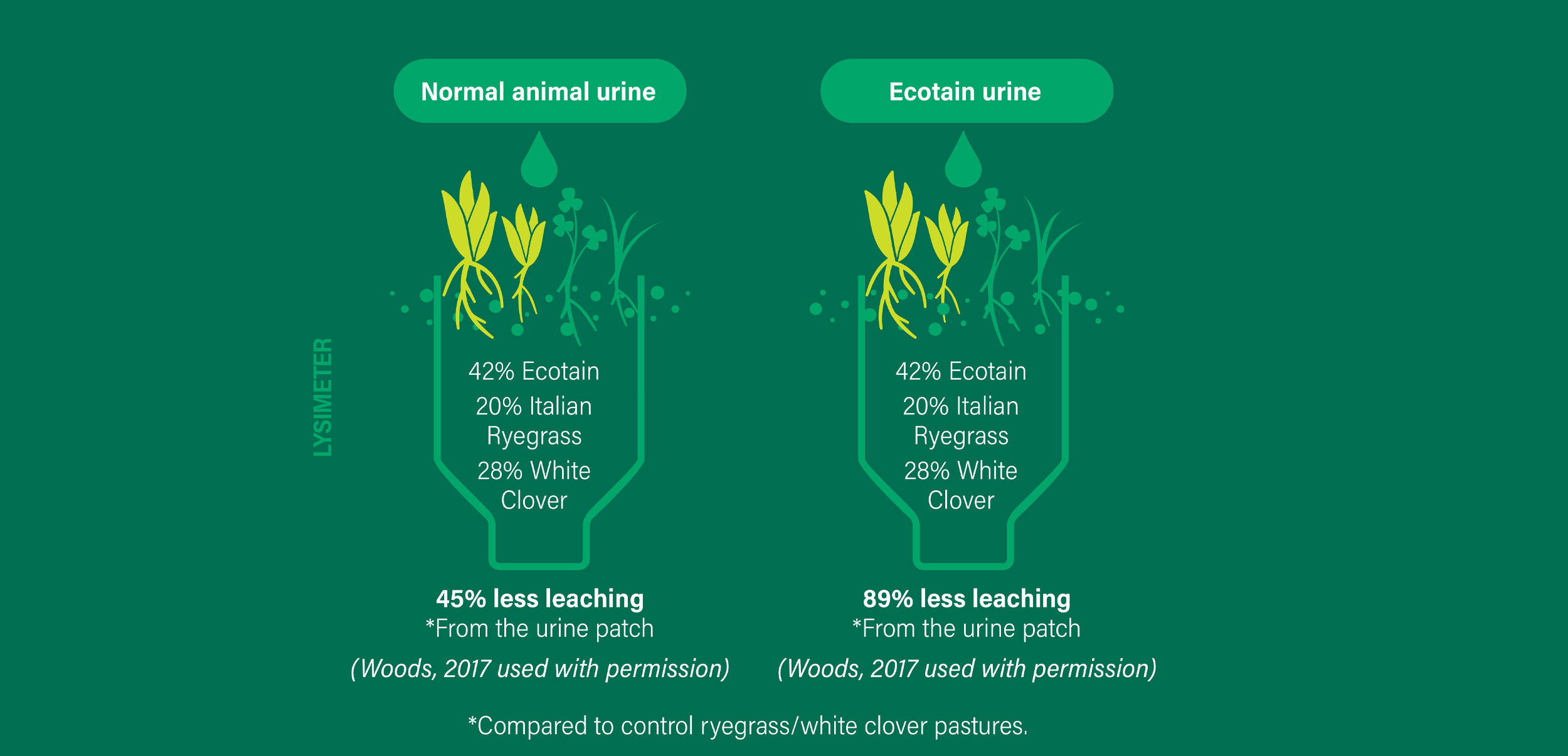 Ecotain environmental plantain increases the volume of urine animals produce from a similar amount of N ingested. This means the N being excreted is in a more dilute form, resulting in a reduced N load in the urine patch. Learn More