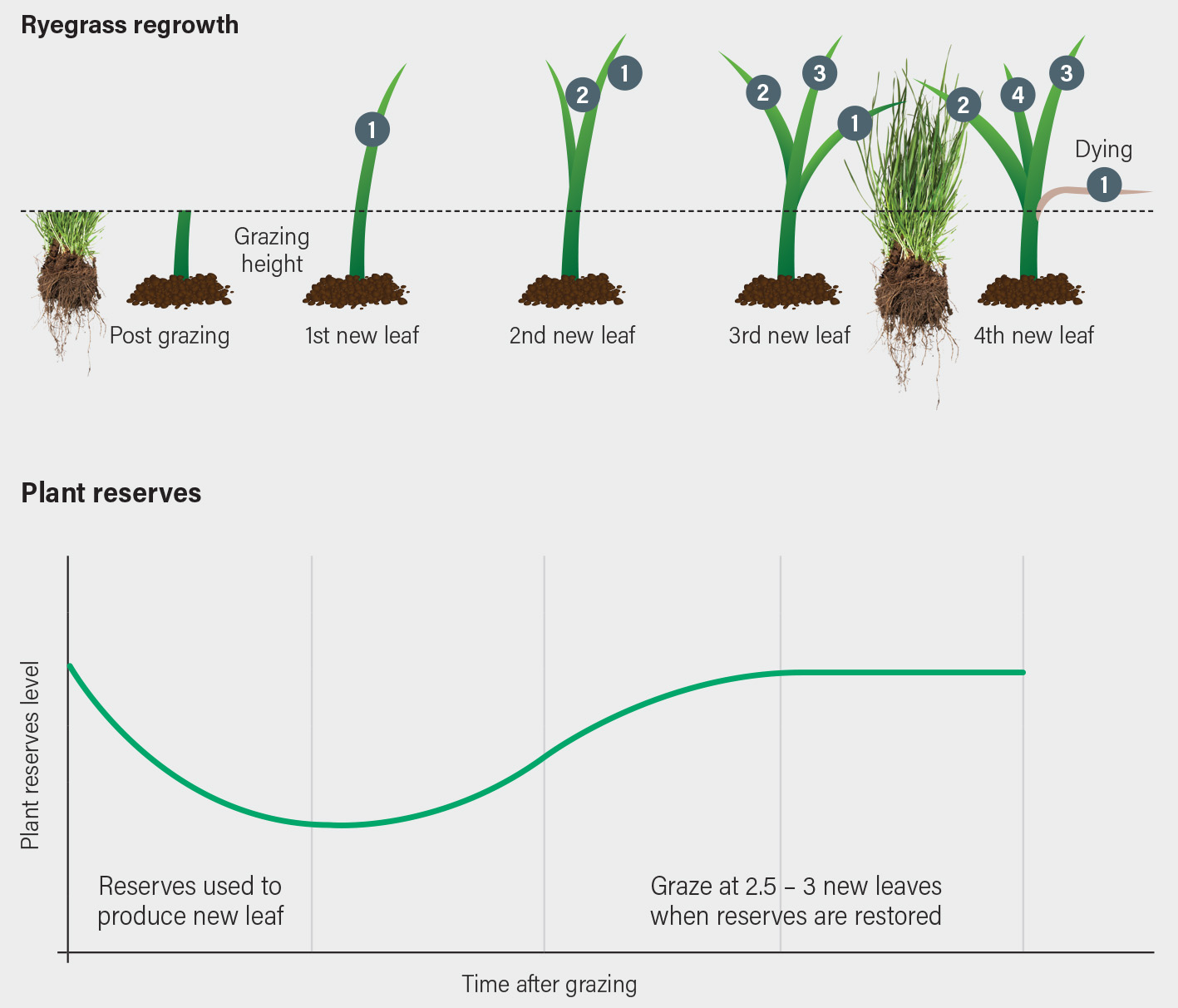 A ryegrass plant is a grouping of tillers (new shoots), each of which produce fresh leaves. A ryegrass tiller can maintain only three to four green leaves at any time and these leaves are the means by which (through photosynthesis) the plant converts light into energy, thereby driving growth that is measured as drymatter (DM). Grazing a plant early will reduce the leaf area, and therefore the plant’s ability to photosynthesise. During this period the plant will rely on stored energy for growth, until the first new leaf phase and while this occurs pasture growth is delayed. Hence the statement ‘grass grows grass’.