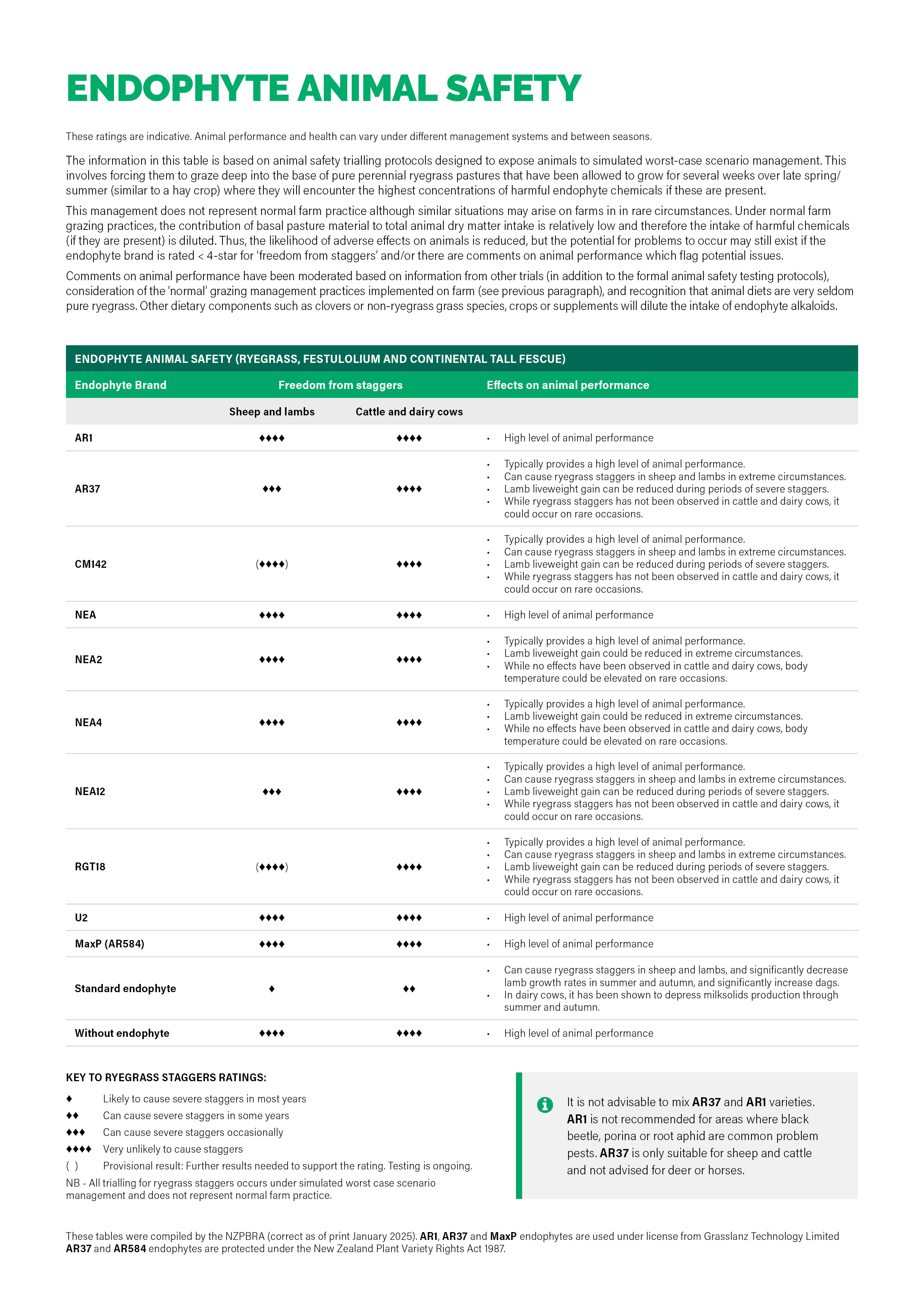 The information in this table is based on animal safety trialling protocols designed to expose animals to simulated worst-case scenario management. This involves forcing them to graze deep into the base of pure perennial ryegrass pastures that have been allowed to grow for several weeks over late spring/summer (similar to a hay crop) where they will encounter the highest concentrations of harmful endophyte chemicals if these are present.