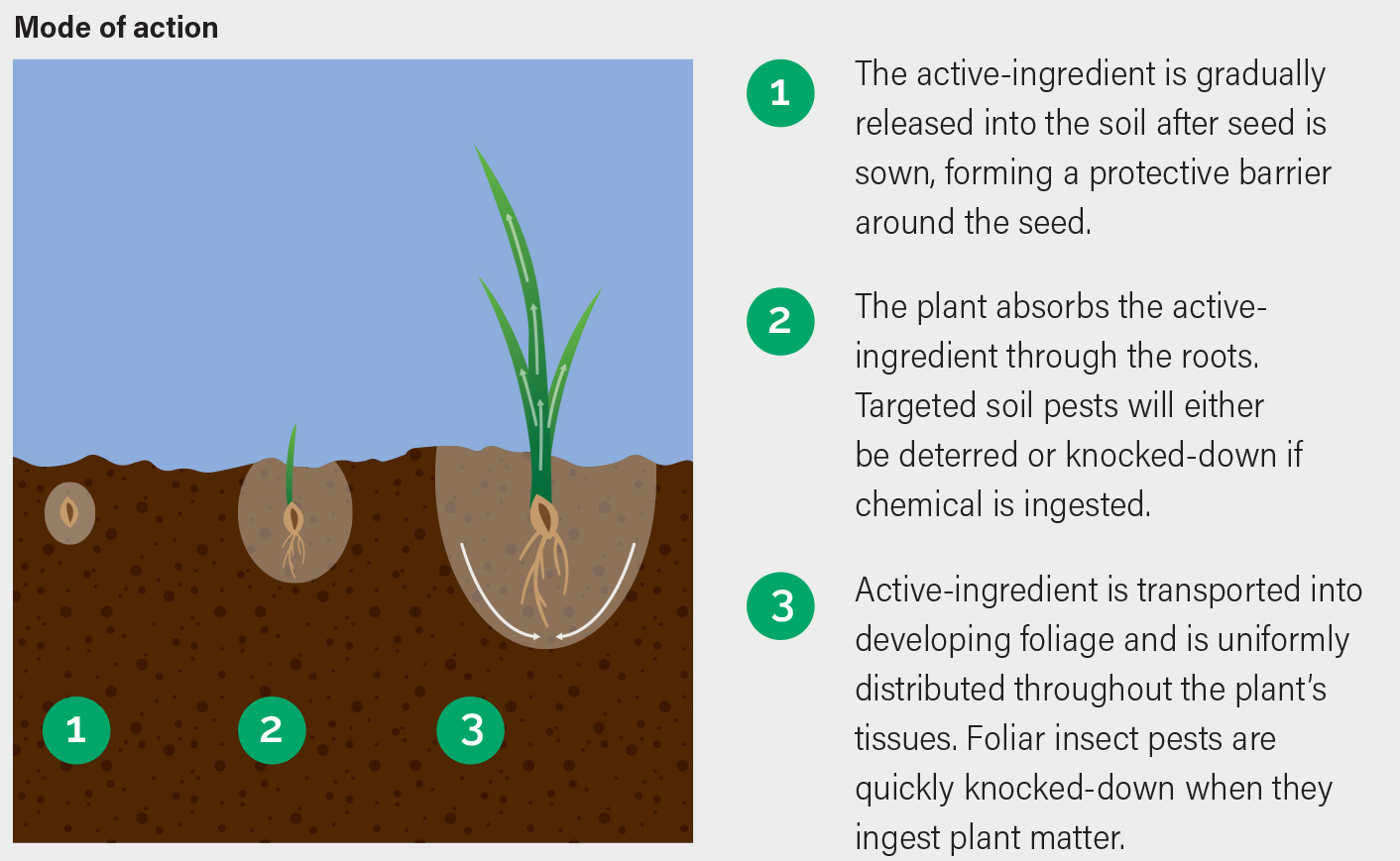 Insecticides included in seed treatment products are typically systemic in terms of their transmission, protecting seedlings during the first six weeks of establishment to the point where plants are in a much better position to withstand pest attack. It is also at this point where novel endophytes in some ryegrass cultivars begin to take over as the long-term plant protection mechanism.